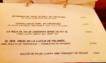Ens van explicar que la cosa anava de plats a compartir i que per dos persones en demanéssim 4 o 5. I això vam fer. En tot cas aquí podeu veure la carta… Molt producte de proximitat amb nom i cognom (em limito a comentar-ho, doncs sabeu que no soc cap talibà del Km0… Ho trobo bé i ho segueixo, però si un dia em ve de gust una cosa llunyana, la incorporo sense haver de flagel·lar-me).